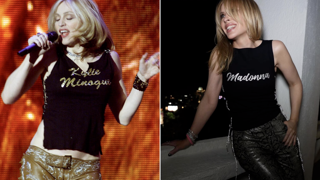 Madonna et Kylie Minogue ont toujours exprimé leur admiration mutuelle. Un des moments les plus mémorables de cette appréciation mutuelle a été lorsque Madonna a porté un t-shirt avec l’inscription “Kylie Minogue” lors d’une performance aux MTV Europe Music Awards. En réponse à ce geste, Kylie a partagé une vidéo d’elle-même dansant dans la foule lors du concert de Madonna, portant un t-shirt avec l’inscription « Madonna ». Ce geste symbolique a montré au monde leur respect mutuel et leur admiration l’une pour l’autre.